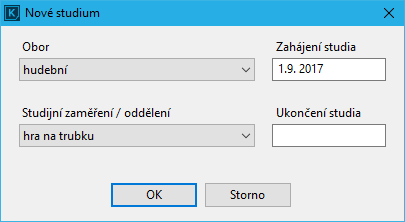 V otevřeném dialogu vyberte pro vložení studia dole tlačítko Nové. Otevře se dialog Nové studium, kde vyberete Obor, Studijní zaměření a Zahájení studia. Potvrdíte tlačítkem OK.