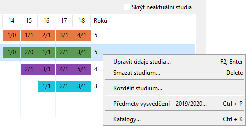 Následné úpravy studií lze pomocí tlačítek v menu nebo pravým tlačítkem myši na daném roku studia.
