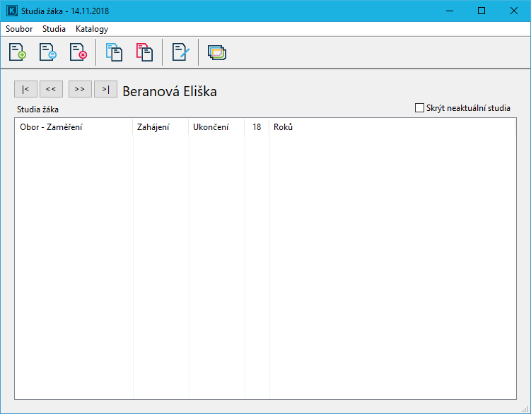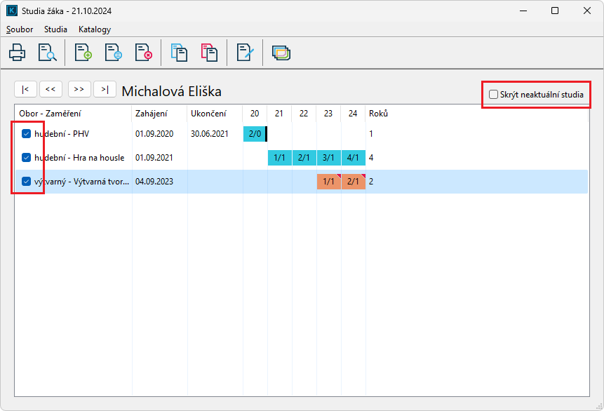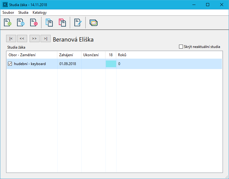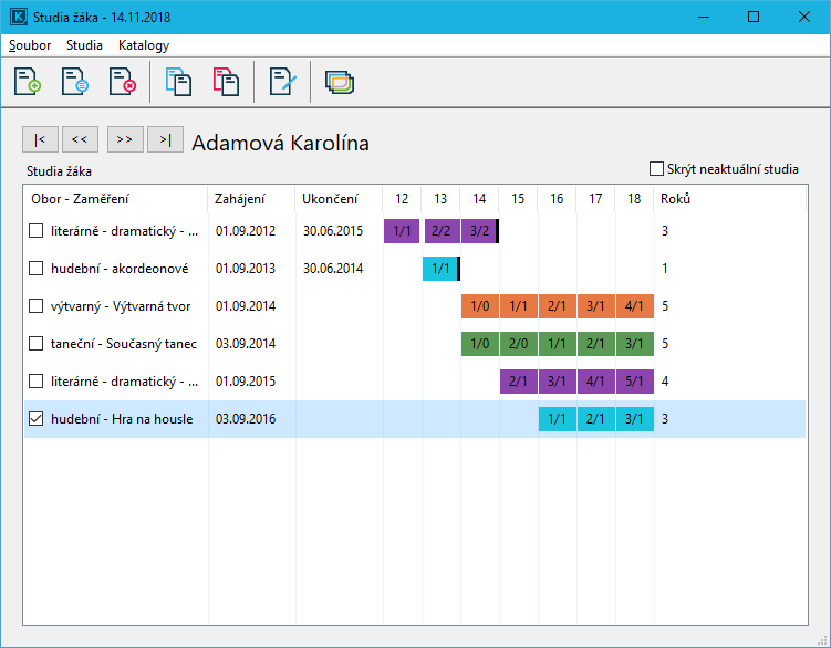 Studia žáka otevřete v hlavním okně programu pravým tlačítkem myši na žákovi a vyberete Studia žáka nebo označte žáka a stiskněte klávesu F7.