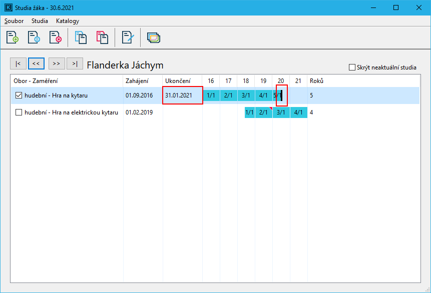 V případě ukončení studia doplňte ke studiu datum ukončení. Po tomto datu se nebude žák zobrazovat.
