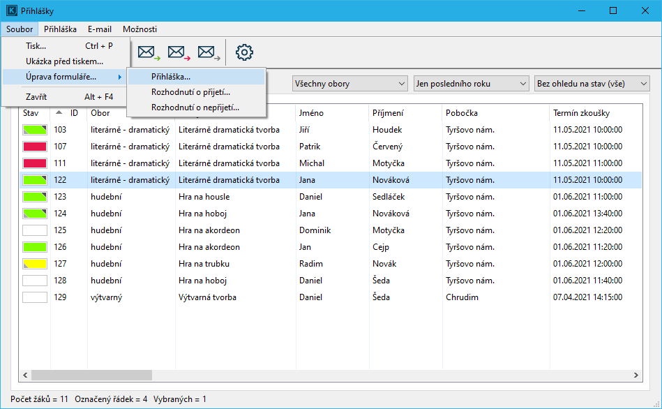 Z programu lze vytisknout nebo odeslat na email rozhodnutí o ne/přijetí žáka a přihlášku ke studiu v menu Soubor/Přihlášky.