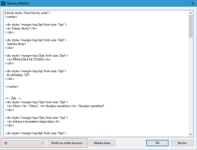 Pokud chceme použít výchozí vzor přihlášky v programu, tak je nutné v nastavení nemít zaškrtnuto volbu „Pro tisk přihlášky použít vlastní vzor“. Nyní bude použit pevný vzor s možností vložení vlastního textu a položkami: